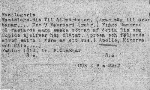 //// Fastlagsris //// Fastelafrs-Ris ?il Ällnärheten. (Ägan vväg til ärai banar, „. . Der 9 Februari (rubr.). Fi$£o Damorne på fastande m aga tro ak a söt-an af detta Ris so® Cupide sjelfwer hop flätat, (prosa och följande strof,satta i ^orm av ett ris.) Apollo, Mi^erva och Ölio...) ^riii*.*, //// Fahlun 1812, tr. P.O,Aicnar //// 8 s, 8;o ' ; //// ' • • ; UUE 2 P s 22:2 ////