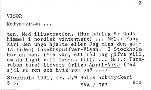 //// VISOR //// Kofva-visan ... //// ten. Med illustration. (Hur härlig är Guds himmel i nordisk vinternatt! ... Mel.: Kung Karl den unge hjelte eller Jag mins den gamla tiden) Insektspulfver-Visan. I Stockholm bor en man. (Min vän, ett råd jag gifva vill, om du lugnt vill lyssna till. ... Mel.: Tara-rabom tara) Lifvets årliga April-Visa (Med själ så ren och hvit som snö ...) //// Stockholm 1901, tr. J.W Holms boktryckeri 8 s. 3VA A 7R? 8:0 ////