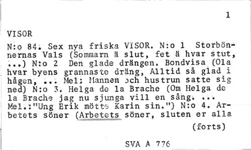 //// 1 //// VISOR //// Nio 84. Sex nya friska VISOR. N:o 1 Storbön-nernas Vals (Sommarn ä slut, fet ä hvar stut, ...) N:o 2 Den glade drängen. Bondvisa (Ola hvar byens grannaste dräng, Alltid så glad i hågen, ... Mel; Mannen jch hustrun satte sig ned) N:o 3. Helga de la Brache (Om Helga de la Brache jag nu sjunga vill en sång. ... Mel.:"Ung Erik mötte Xarin sin.") N:o 4. Arbetets söner (Arbetets söner, sluten er alla //// (forts) //// SVA A 7?6 ////