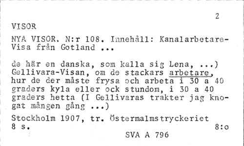 //// 2 //// VISOR //// NYA VISOR, N:r 108. Innehåll: Kanal arbetare-Visa från Gotland ... //// ds här en danska, som kalla sig Lena, ...) Gellivara-Visan, om de stackars arbetare, hur de der måste frysa och arbeta i 30 a 40 graders kyla eller ock stundom, i 30 a 40 graders hetta (I Gellivaras trakter jag knogat mången gång ...) //// Stockholm 1907, tr. Östermalms tryckeriet 8 s. 8:o //// SVA A 796 ////
