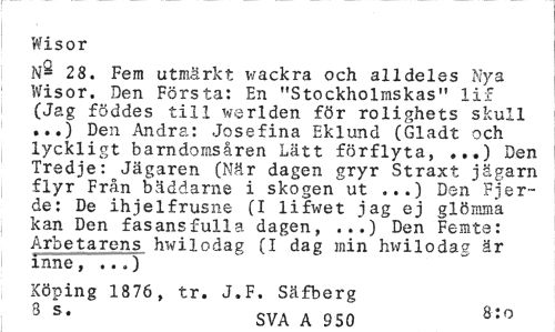 //// Wisor //// nS 28. Fem utmärkt wackra och alldeles Nya Wisor. Den Första: En "Stockholmskas" lif (Jag föddes till werlden för rolighets skull ...) Den Andra: Josefina Eklund (Gladt och lyckligt barndomsåren Lätt förflyta, ...) Den Tredje: Jägaren (När dagen gryr Straxt jägarn flyr Från bäddarne i skogen ut ...) Den Fjer-de: De ihjelfrusne (I lifwet jag ej glömma kan Den fasansfulla dagen, ...) Den Femte: Arbetarens hwilodag (I dag min hwilodag är inne, ...) //// Köping 1876 , tr. J.F. Säfberg //// 3 s* SVA A 950 8:0 ////