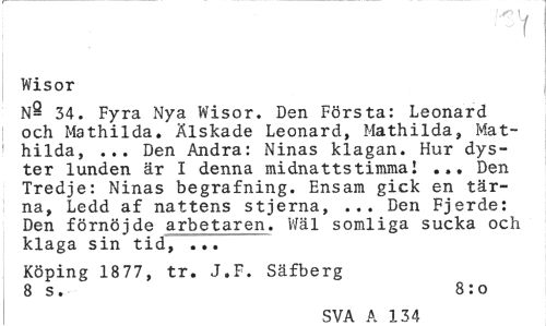 //// '1 //// Wisor //// N§ 34. Fyra Nya Wisor. Den Första: Leonard och Mathilda. Älskade Leonard, Mathilda, Mathilda, ... Den Andra: Ninas klagan. Hur dyster lunden är I denna midnattstimma I ... Den Tredje: Ninas begrafning. Ensam gick en tärna, Ledd af nattens stjerna, ... Den Fjerde: Den förnöjde arbetaren. Wäl somliga sucka och klaga sin tid, ... //// Köping 1877, tr. J.F. Säfberg 8 s. 8 : o //// SVA A 134 ////
