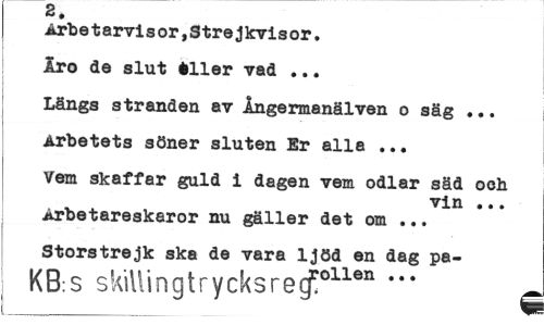 //// 2. //// Arbetarvisor,Strejkvisor. //// Iro de slut iller vad ... //// Längs stranden av Ångermanälven o säg ... //// Arbetets söner sluten Er alla ... //// Vem skaffar guld i dagen vem odlar säd oeh //// vin ... //// Arbetareskaror nu gäller det om ... Storstrejk ska de vara ljöd en dag pa- //// KB:S skillingtrycksreefollen — //// ___ ™ ////