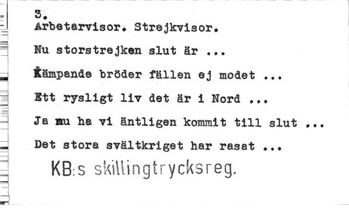 //// 3. //// y Arbetarvisor. Strejkvisor. //// Nu storstrejken slut är ... d dämpande bröder fällen ej modet ... Ett rysligt liv det är i Nord ... i Ja mi ha vi äntligen kommit till slut ... Det stora svältkriget har rasat ... //// ^ KB:S skillingtrycksreg. ////