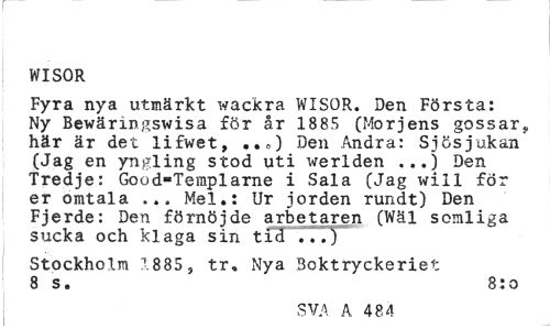 //// WISOR //// Fyra nya utmärkt wackra WISOR. Den Första: Ny Bewäringswisa för år 1885 (Morjens gossar,, här är det lifwet, .•8) Den Andra: Sjösjukan (Jag en yngling stod uti werlden ...) Den Tredje: Good-Templarne i Sala (Jag will för er omtala ... Mel.: Ur jorden rundt) Den Fjerde: Den förnöjde arbetaren (Wäl somliga sucka och klaga sin tid ...) //// Stockholm 1885, tr. Nya Boktryckeriet //// 8 s. 8:o //// SVA A 484 ////