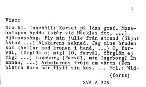 //// 1 //// Visor //// N:o 61. Innehåll: Korset på Idas graf» Mossbelupen hydda (står vid Häcklas fot, .ii) Sjömanssång. Fly min julle från strand (Skjut åstad ...) Älskarens saknad. Jag mins bruden som (hvilar med kronan i hand, ...) 0, farväl, förglöm ej mig,' (0, farväl, förglöm ej mig] ...) Ingeborg (Farväl, min IngeborgJ En annan, ...) Arbetarens fröjd om våren (Den bistra Bore har flytt sin kos. ... Mel.: Wid- //// (forts) //// SVA A 325 ////