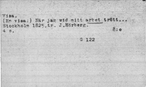 //// V j sa. //// (En visa;) Kär jag v/icJ mitt arbet trött.,. Stockholm l825,tr. J.Hörberg T 4 s. 8; o //// G 122 ////