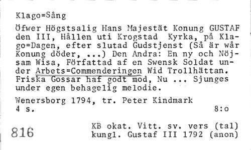 //// Klago=Sång //// öfwer Högstsalig Hans iMajestät Konung GUSTAF den III, Hållen uti Krogstad Kyrka, på Kla-go=Dagen, efter slutad Gudstjenst (Så är wår Konung döder, ...) Den Andra: En ny och Nöjsam Wisa, Författad af en Sivensk Soldat under Arbets=Commenderingen Wid Trollhättan. Friska Gossar haf godt mod, Nu ... Sjunges under egen behagelig melodie. //// Wenersborg 1794, tr. Peter Kindmark 4 s. 8:0 //// 0i „ KB okat. Vitt. sv. vers (tal) //// ölb kungl. Gustaf III 179 2 (anon) ////