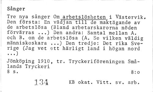 //// Sånger //// Tre nya sånger Om arbetslösheten i Västervik. Den första: En vädjan till de maktägande av de arbetslösa (Bland arbetarskarorna nöden förvärras ...) Den andra: Samtal mellan A. och B. om de arbetslösa (A. Se vilken väldig människoskara ...) Den tredje: Det rika Sverige (Jag vet ett härligt land i högan nord //// Jönköping 1910, tr. Tryckeriföreningen Smålands Tryckeri //// 8 s. 8:0 //// J 34 KB okat. Vitt. sv. arb. ////