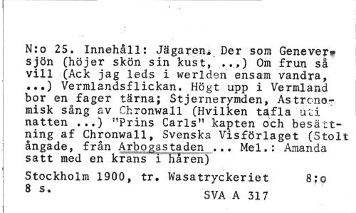 //// N:o 25. Innehåll: Jägaren, Der som Genever* sjön (höjer skön sin kust, ...) Om frun så vill (Ack jag leds i werlden ensam vandra, ...) Vermlandsflickan. Högt upp i Vermland bor en fager tärna; Stjernerymden, Astronomisk sång av Chronwall (Hvilken tafla uti natten ...) "Prins Carls" kapten och besättning af Chronwall, Svenska Visförlaget (Stolt ångade, från Arbogastaden ... Mel.: Amanda satt med en krans i håren) //// Stockholm 1900, tr. Wasatryckeriet 8:0 //// 8 s* SVA A 317 ////