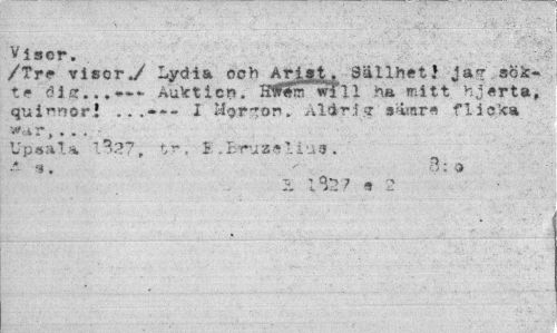 //// Visor. //// /Tre visor./ Lydia och A ris t. 3'ållhetJ Ja*? sökte öisj...—- Auktion. HW8nTwIll ha mitt hjerta, quinnor! I Mor-ron. Aldrig sämre flicka //// .. . ¦ //// Upsala tr. E.Bruzellus. //// <3 . o . J //// It 1^2 7 i 2 ////