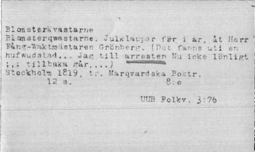 //// Blcrastärkvastarne //// B.lomaterqwastarne. J uIk lat-par fér i ar. it Herr Far; t?-W ak tia as t a ren Grcnber;-*. (Pct fanns uti en hufwudslad .. „ j'a£ till arrsten Ku 'icke- Icnligt //// til Ibaita rar, ,..) ... //// Stockholu l8l9 , tr, Sfarqvard ska Poi-ctr. 12 3. ' 8:o //// UUB Folkv, 3:76 ////