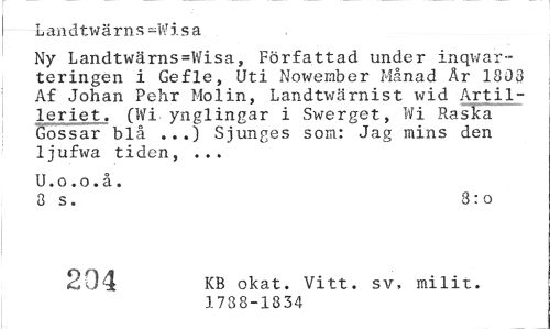 //// Landtwärns=Wisa //// Ny Landtwärns=Wisa, Författad under inqwar-teringen i Gefle, Uti Nowember Månad År 1803 Af Johan Pehr Molin, Landtwärnist wid Artilleriet. (Wi ynglingar i Swerget, Wi Raska Gossar blå ...) Sjunges som: Jag mins den ljufx\ra tiden, ... //// U.o.o.å. //// 8 s. 8:0 //// 204 KB okat. Vitt. sv, milit. //// 1738-1334 ////