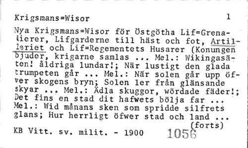 //// Krigsmans=Wisor 1 //// Nya Krigsmans=Wisor för Östgötha Lif=Grena-lierer, Lifgarderne till häst och fot, Artilleriet och Lif=Regementets Husarer (Konungen bjuder, krigarne samlas ... Mel.: Wikingasä-teni åldriga lundarJ; När lustigt den glada trumpeten går ... Mel.: När solen går upp öf-ver skogens bryn; Solen ler från glänsande skyar ... Mel.: Ädla skuggor, wördade fäder!; Bet fins en stad dit hafwets bölja far ... Mel.: Wid månans sken som spridde silfrets glans; Hur herrligt öfwer stad och land ... //// (forts) //// KB Vitt. sv. milit. - 1900 105o ////
