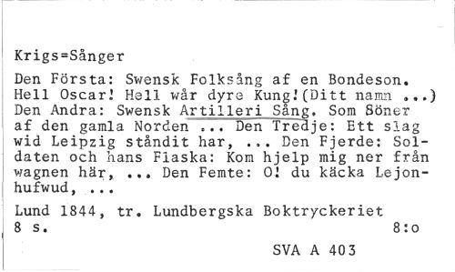 //// Krigs=Sånger //// Den Första: Swensk Folksång af en Bondeson. Hell Oscar 1 Hell v/år dyre Kung.'(Ditt namn ,..) Den Andra: Swensk Artilleri Sång. Som Söner af den gamla Norden ... Den Tredje: Ett slag wid Leipzig ståndit har, ... Den Fjerde: Soldaten och hans Flaska: Kom hjelp mig ner från wagnen här, ... Den Femte: 01 du käcka Lejon-hufwud, ... //// Lund 1844, tr. Lundbergska Boktryckeriet 8 s. 8:o //// SVA A 40 3 ////
