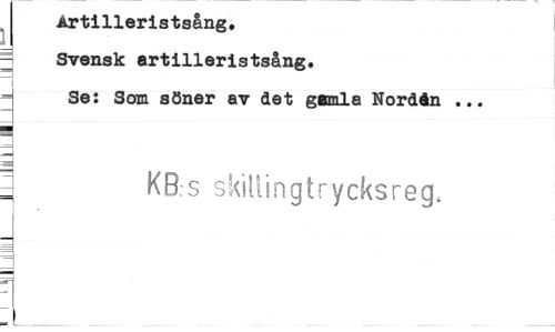 //// I Artilleristsång. //// = Svensk artilleristsång. //// i //// Se: Som söner av det gamla Nordån ... //// I KB s skillingtrycksreg. ////