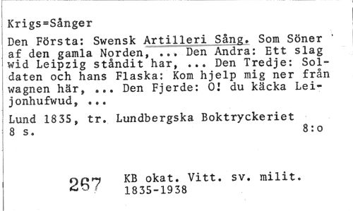 //// Krigs=Sånger //// Den Första: Swensk Artilleri Sång. Som Söner ' af den gamla Norden, ... Den Andra: Ett slag wid Leipzig ståndit har, ... Den Tredje: Soldaten och hans Flaska: Kom hjelp mig ner från wagnen här, ... Den Fjerde: 01 du käcka Lei-jonhufwud, ... //// Lund 1835, tr. Lundbergska Boktryckeriet 8 s. 8: o //// Q07 KB okat. Vitt. sv. milit. //// ^ f 1835-1938 ////
