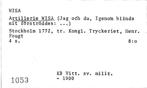 //// WISA //// Artillerie WISA (Jag o di du, Igenota blinda nit förströddes: ...) //// Stockholm 1772, tr. Kongl. Tryckeriet, Henr. Fougt //// 4 s. 8:0 //// KB Vitt. sv. milit. //// 1053 - 1900 ////