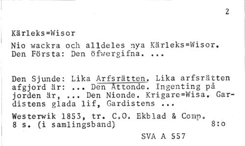 //// 2 //// Kärleks=Wisor //// Nio wackra och alldeles nya Kärleks=Wisor. Den Första: Den öfwergifna. ... //// Den Sjunde: Lika Arfsrätten. Lika arfsrätten afgjord är: ... Den Ättonde. Ingenting på jorden är, ... Den Nionde. Krigare=Wisa, Gar-distens glada lif, Gardistens ... //// Westerwik 1853, tr. Ca0. Ekblad & Comp, 8 s. (i samlingsband) 8:o //// SVA A 55 7 ////