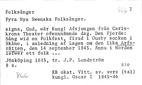 //// T //// Folksånger //// Fyra Nya Swenska Folksånger. //// signa, Gud, wår Kung! Afsjungen från Carlskrona Theater ofwannämnde dag. Den Fjerde: Sång wid en Folkfest, firad i Ousby socken i Skåne, i anledning af Lagen om den lika Arfs-rätten, den 14 september 1845. Ännu i Norden lefwer ett folk ... //// Jönköping 1845, tr. J.P. Lundström 8 s. 8:o //// KB okat. Vitt. sv. vers (tal) //// öVoC» kungl. Oscar I 1845-46 ////