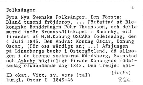 //// 1 //// Folksånger //// Fyra Nya Swenska Folksånger. Den Första: Bland tusend fröjderop, ... Författad af Ble-kongske Bonddrängen Pehr Thomasson, och dekla merad inför Brunnssällskapet i Runneby, wid firandet af H.M.Konung OSCARS födelsedag, den 4 Juli 1845. Den Andra: Konung Oscar, Konung Oscar, (För oss wärdigt an; ...) Afsjungen på Linneberga backe i Östergötland, då allmogen i de trenne socknarna Wårdsberg, Swinstad och Askeby högtidligt firade Konungens födelsedag ofwannämnde dag 1845. Den Tredje: Wäl- //// KB okat. Vitt. sv. vers (tal) (forts) //// kungl. Oscar I 1845-46 ////