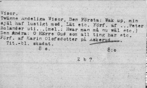 //// Visor. //// Twänne Andeliga "flisor, Den Första; Wak up, min själ haf lustigt mod, Lät etc. Förf. af ...Peter Roländer uti ...(mel.; Hwar man må nu wäl etc.) Den Ändra; O HErre Gud som all ting har etc. Förf. af Karin Olofsdotter på -*aic—. Tit.-ti. skadat. — //// 8 s. 8:0 //// Z b 7 ////
