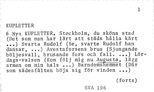 //// 1 //// KUPLETTER //// 6 Nya KUPLETTER. Stockholm, du sköna stad (Det som man har lärt att städs hålla kärt ...) Svarta Rudolf (Se, svarte Rudolf han dansar, ...) Avestaforsens brus (Sjungande böljesvall, brusande fors och fall. ...) Lördags-valsen (Kom följ mig nu Augusta, lägg armen om min hals ...) Barndomshemmet (Där som sädesfälten böja sig för vinden ...) //// (forts) //// SVA 196 ////