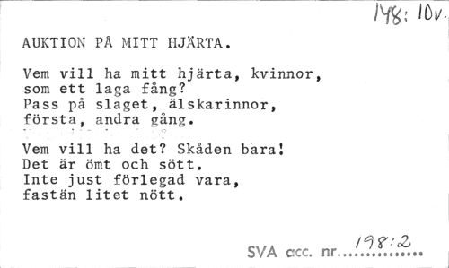 //// /w: //// AUKTION PÄ MITT HJÄRTA. //// Vem vill ha mitt hjärta, kvinnor, som ett laga fång? Pass på slaget, älskarinnor, första, andra gång. //// Vem vill ha det? Skåden bara! Det är ömt och sött. Inte just förlegad vara, fastän litet nött. //// ca/A //// SVA ccc. nr... ////