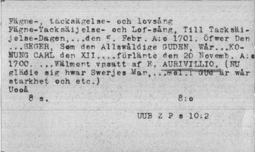 //// Fägne-, tacksägelse- och lovsång Fägne-1'acksäij else- och Lof-sång, Till Tacksäi-j else-Dagen, , . .den c. Febr. A: o 1701. öfwer Den ...SEGER, Sem den Allswåldige GUDEN, Wår...KONUNG CARL den XII...förlänte den 20 Noverob. A: i 1700. ...Välment vpsatt af E, AURIVILLIO. (NU glädie aip. hwar Swerjes Man,. .T^^rf^W^är wår starkhet ooh etc.) Ueoå //// ? s. 8;o //// UUB Z ? s 10;2 ////