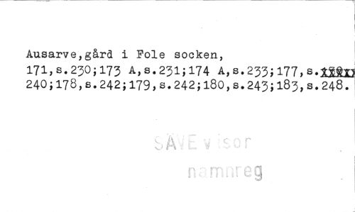 //// Ausarve,gård i Fole socken, //// I7i,8.230;i73 a,s.231;174 A,s.233;i77,B.ix«x: 240;178,s.242;179,s.242;180,s.243J183,s.248. //// SåVE v 'sar //// n. m.;reg ////