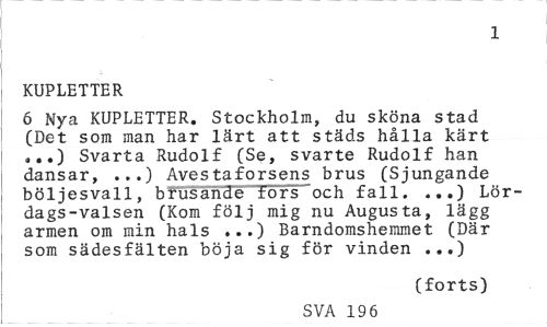 //// 1 //// KUPLETTER //// 6 Nya KUPLETTER. Stockholm, du sköna stad (Det som man har lärt att städs hålla kärt //// Svarta Rudolf (Se, svarte Rudolf han dansar, ...) Avestaforsens brus (Sjungande böljesvall, b rusande tors "och fall. ...) Lördags-valsen (Kom följ mig nu Augusta, lägg armen om min hals ...) Barndomshemmet (Där som sädesfälten böja sig för vinden ...) //// (forts) //// SVA 196 ////