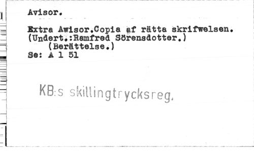 //// I Avisor. //// 3 Extra Awisor.Copia af rätta skrifwelsen. //// 3 (Undert.:Bamfred Sörensdotter.) //// - (Berättelse.) //// | Se: A 1 51 //// " KB:s skillingtrycksreg, //// L___ ////