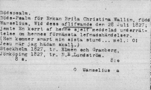 //// Död apsalm, //// Död s-Psalm för Enkan Brita Christina Wallin, född fanselius, Wid deaa afllfwandc der 28 öuli l827i jemte En korrt af henne ajélfm ed delad underrättelse an hennes förnämsta lefnadshändelser. (Hon kommer snart min sista stund... mel,; OJ Jesu när jag hädan skall.) Stockholm 1827, tr. Elmén och Granberg, Jönköping 1827, tr. l).E.iundström. //// 8 s. 8:o //// 0 Wanaelius a ////