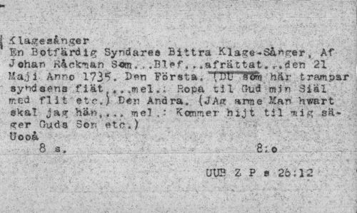 //// i lagesånger //// En Botfärdig Syndares Bittra Klage-Sånger, Af Johan R&ckman Som» . .BTef „ , .afrättat,,,den 21 Maj i Anno 1735. ?örrta.1 (WWa här trampar syndaens f iät ,, .mel.; Ropa til Gud min Siäl med flit' ete,} Den Andra, (JAg anne Man hwart skal jag h&n,« .. mel ,: Kommer hijt til mig säger Guds Son etc.) Uooå //// u 8 s, . ¦ 8;.o //// UUS Z P 9 26; 12 ////