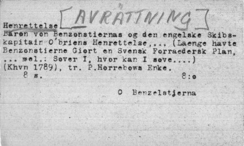 //// ¦ ttl Mm^/MM //// Henrettelse ...—4 //// Mrsn vorTfeenzonstiernas og den engelske Skibs-kapitair 0'brlens Henrettelse,.., (Laenge hävte Benzonstierne Giort en Svensk Porraedersk Plan, ... n«el.; Sover I, hvor kan I sove...} (Khvn 1789). tr. P.Horrebews Enke. //// 8 s. 8:0 //// 0 Bfnzelstjerna ////