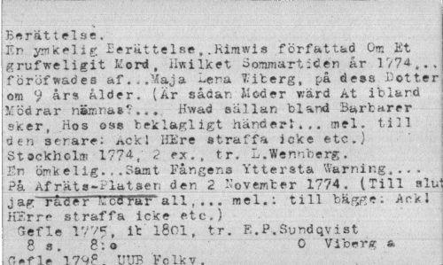 //// Berättelse. //// Er ymkel ig Eerätte 1 se ,.Rimwis författad Om Et grufweligit Körd, ilwilket Sommartiden år 1774,.. föröfwades af...Maja I-ena V.iberg, på dess Dotter om 9 års ålder. (Ar sådär. Moder wärd At ibland Mödrar nämnas?,., Hwad sällan bland Barbarer sker, Hos oss beklagligt händerfr... mel. ti31 den senare; Ackl HEre straffa icke etc.) Stockholm 1774, 2 ex., tr. L.Wennberg. En ömkelig...Samt Fångens Yttersta Warning,... På Afräta-Piatsen den 2 November 1774. (Till slu jag räcer r.;ccrar all,... mel.: till bägge. Ackl HFrre straffa icke etc.) Sefle 1775, ib 1801, tr. E.P.Syndqvist 8 s. 8;o 0 Viberg a //// i<-?<iC »'Tro ».ii,. ////