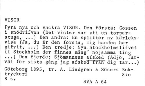 //// VISOR //// Fyra nya och vackra VISOR. Den första: Gossen i snödrifvan (Det vinter var uti en torparstuga, ...) Den andra: En splitter ny kärleksvisa (Ja, du är den första, mig handen har gifvit, ...) Den tredje: Nya Stockholmslifvet (I Stockholm der finnes mång' nöjsamma ting ...) Den fjerde: Sjömannens afsked (Adjö, farväl för sista gång jag afsked från dig tar...) //// Göteborg 1895, tr. A. Lindgren & Söners Boktryckeri 8:0 //// 8 s* SVA A 64 ////