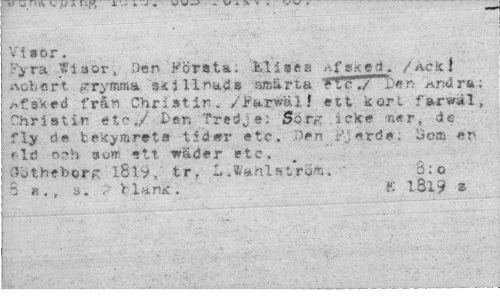 //// Visor. //// ?yra ^iaor, Den Kora ta: jfcliaéa ^fsked. /Ack I Aob o r t grymma s<t i l X nad a smä-rta c. n And ra; //// /»t ax ed från Chriatir. /P&rwsli! ett kort farwal, Christir etc./ Ler, Tredje: Sorg icke -ner, de fly de bekymret a tid#r etc. Den r'j«rde: Uom en f Id orsh so* ett wäder etc. //// CKStheb-org l8l9. tr. L.Wahlstram. b: o //// 5 b,, s. ;-' blank. K isl? z ////