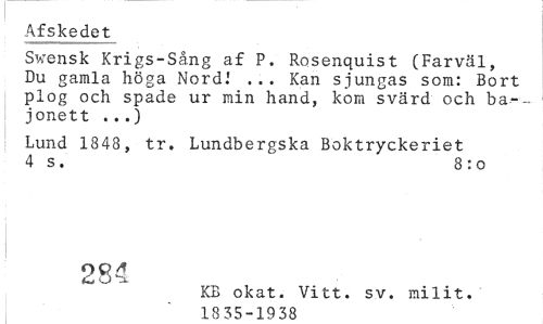 //// Afskedet //// Swensk Krigs-Sång af P. Rosenquist (Farväl, Du gamla höga Nord.' ... Kan sjungas som: Bort plog och spade ur min hand, kom svärd och ba-~ jonett ...) //// Lund 1848, tr. Lundbergska Boktryckeriet 4 s. 8:0 //// 284 //// KB okat. Vitt. sv. milit. //// 1835-1938 ////