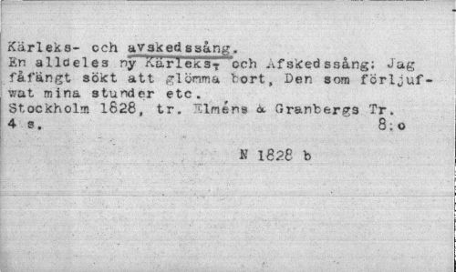 //// Kärleks- och avsked ssång. //// En alldeles ny Kärlek3? och -vf sked ssång; Jag fåfängt sökt att glömma bort, Den som fcrljuf-wat mina stunder etc. //// Stockholm 1828, tr. Alnens a. Granbergs Tr. 4 s. 8;o //// N 1828 b ////