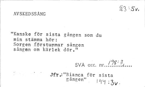 //// 23 '-Si/. //// AVSKEDSSÄNG //// "Kanske för sista gången som du min stämma hör: Sorgen förstummar sången sången om kärlek dör." //// SVA gcc. nr.. //// Jfr.:"Bianca för sista //// gången" ////