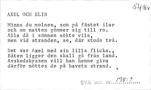 //// tf/Sv //// AXEL OCH ELIN //// Minns du molnen, som på fästet ilar och om natten gömmer sig till ro. Alla då i sömnen sökte vila, men vid stranden, se, där stodo två. //// Det var Axel med sin lilla flicka., Båten ligger den skall gå från land. Avskedskyssen vill han henne giva därför möttes de på havets strand. //// * //// SVÅ aec. nr.. ////
