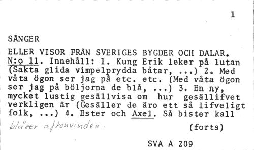 //// 1 //// SÅNGER //// ELLER VISOR FRÅN SVERIGES BYGDER OCH DALAR. N:o 11. Innehåll: 1. Kung Erik leker på lutan (Sakta glida vimpel^rydda båtar, ...) 2. Med våta ögon ser jag pa etc. etc. (Med våta ögon ser jag på böljorna de blå, ...) 3. En ny, mycket lustig gesällvisa om hur gesällifvet verkligen är (Gesäller de äro ett så lifveligt folk, ...) 4. Ester och Axel. Så bister kall //// b/c(&€r ¦ (forts) //// SVA A 209 ////