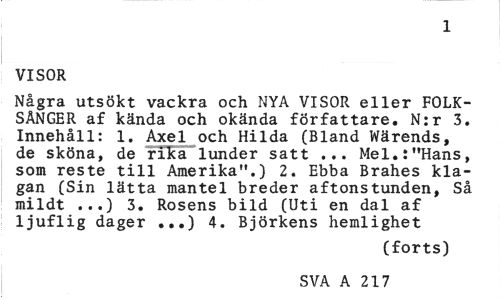 //// 1 //// VISOR //// Några utsökt vackra och NYA VISOR eller FOLKSÅNGER af kända och okända författare. N:r 3. Innehåll: 1. Axel och Hilda (Bland Wärends, de sköna, de rika lunder satt ... Mel.:"Hans, som reste till Amerika".) 2. Ebba Brahes klagan (Sin lätta mantel breder aftonstunden, Så mildt ...) 3. Rosens bild (Uti en dal af ljuflig dager ...) 4. Björkens hemlighet //// (forts) SVA A 217 ////