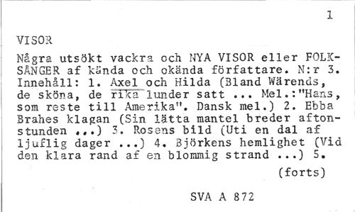 //// I //// VISOR //// Några utsökt vackra och NYA VISOR eller FOLKSÅNGER af kända och okända författare. N:r 3. Innehåll: 1. Axel och Hilda (Bland Wärends, de sköna, de riYä lunder satt ... Mel.:"Hans, som reste till Amerika". Dansk mel.) 2. Ebba Brahes klagan (Sin lätta mantel breder aftonstunden ,,.) 3, Rosens bild (Uti en dal af ljuflig dager ...) 4. Björkens hemlighet (Vid den klara rand af en blommig strand ...) 5. //// (forts) //// SVA A 8 72 ////