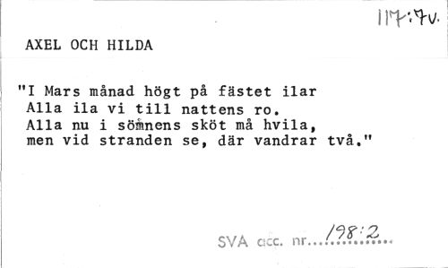 //// i rv-.^h/. //// AXEL OCH HILDA //// "I Mars månad högt på fästet ilar Alla ila vi till nattens ro. Alla nu i sömnens sköt må hvila, men vid stranden se, där vandrar två." //// SVA cscc. nr.. ////