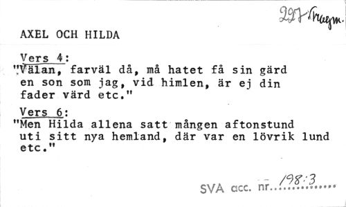 //// AXEL OCH HILDA Vers 4: //// "^älan, farväl då, må hatet få sin gärd en son som jag, vid himlen, är ej din fader värd etc." //// Vers 6: //// "Men Hilda allena satt mången aftonstund uti sitt nya hemland, där var en lövrik lund etc." //// - m-3 //// SVA ccc. nr... ////