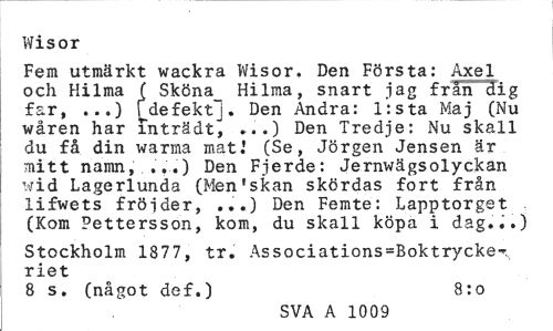 //// Wisor //// Fem utmärkt wackra Wisor. Den Första: Axel och Hilma ( Sköna Hilma, snart jag från äig far, ...) fdefektj. Den Andra: l:sta Maj (Nu wåren har mträdt, ...) Den Tredje: Nu skall du få din warma mat.' (Se, Jörgen Jensen är mitt namn,...) Den Fjerde: Jernwägsolyckan wid Lagerlunda (Men'skan skördas fort från lifwets fröjder, ...) Den Femte: Lapptorget (Kom Pettersson, kom, du skall köpa i dag...) //// Stockholm 1877, tr. Associations=Boktrycke-, riet //// 8 s. (något def.) 8:0 //// SVA A 1009 ////