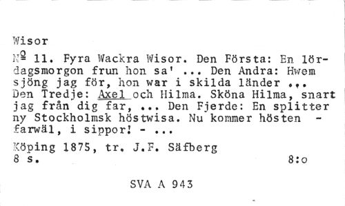 //// Wisor //// K- 11. Fyra Wackra Wisor. Den Första: En lördagsmorgon frun hon sa' ... Den Andra: Hwem sjöng jag för, hon war i skilda länder Den Tredje: Axel och Hilma. Sköna Hilma, snart jag från dig far, ... Den Fjerde: En splitter ny Stockholmsk höstwisa. Nu kommer hösten -farwäl, i sippor! - ... //// Köping 1875, tr. J.F. Säfberg 8 s. 8:o //// SVA A 9 43 ////