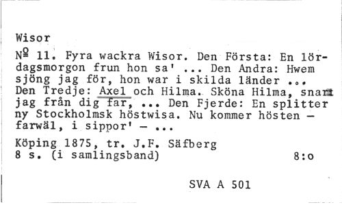 //// Wisor //// N^ 11. Fyra wackra Wisor. Den Första: En lördagsmorgon frun hon sa' ... Den Andra: Hwem sjöng jag för, hon war i skilda länder . 0, Den Tredje: Axel och Hilma. Sköna Hilma, snart jag från dig far, ... Den Fjerde: En splitter ny Stockholmsk höstwisa. Nu kommer hösten -farwäl, i sippor' - ... //// Köping 1875, tr. J.F. Säfberg 8 s. (i samlingsband) 8:o //// SVA A 501 ////